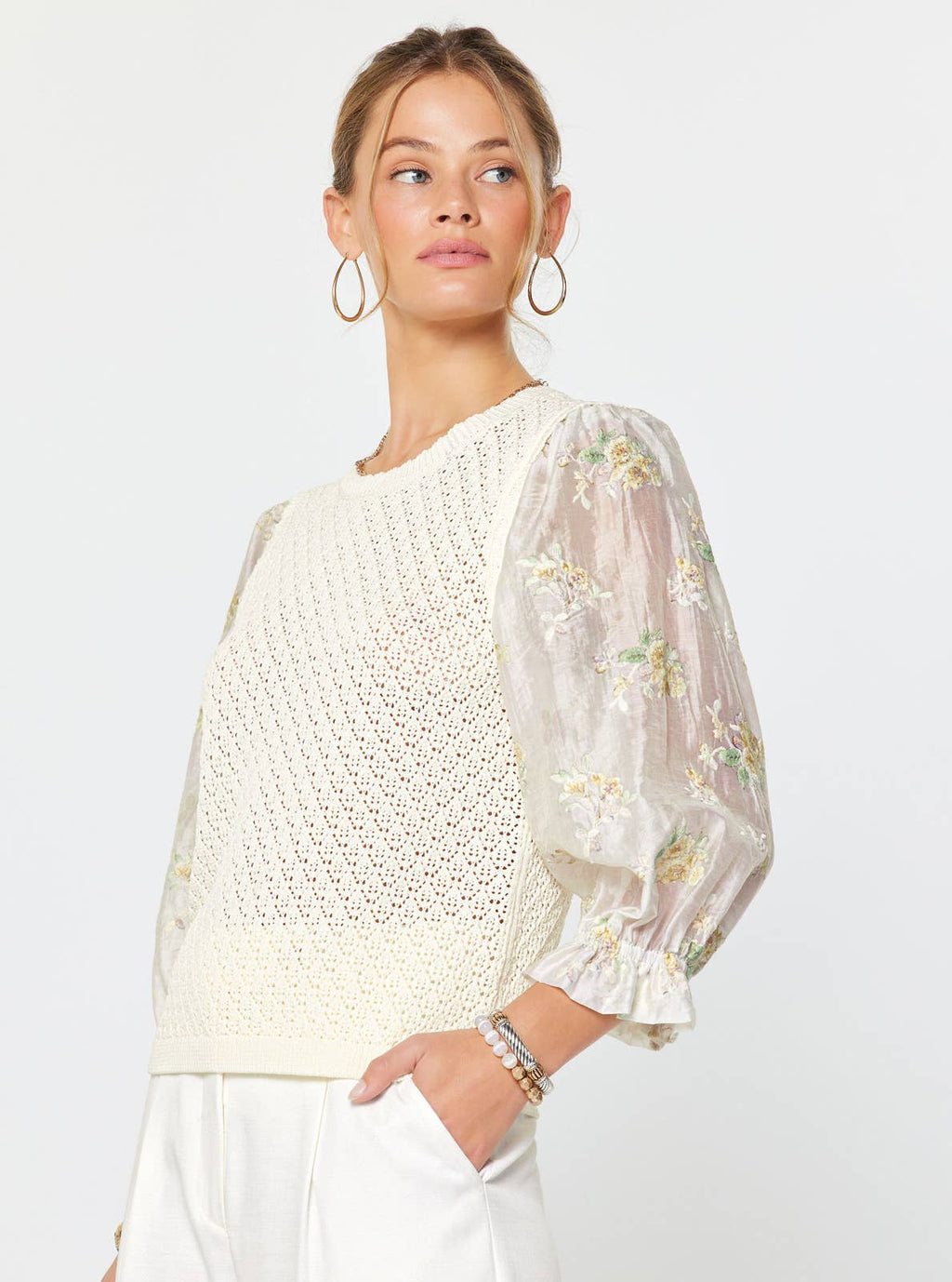 Floral Patch Embroidery Thermal Balloon Sleeve Top