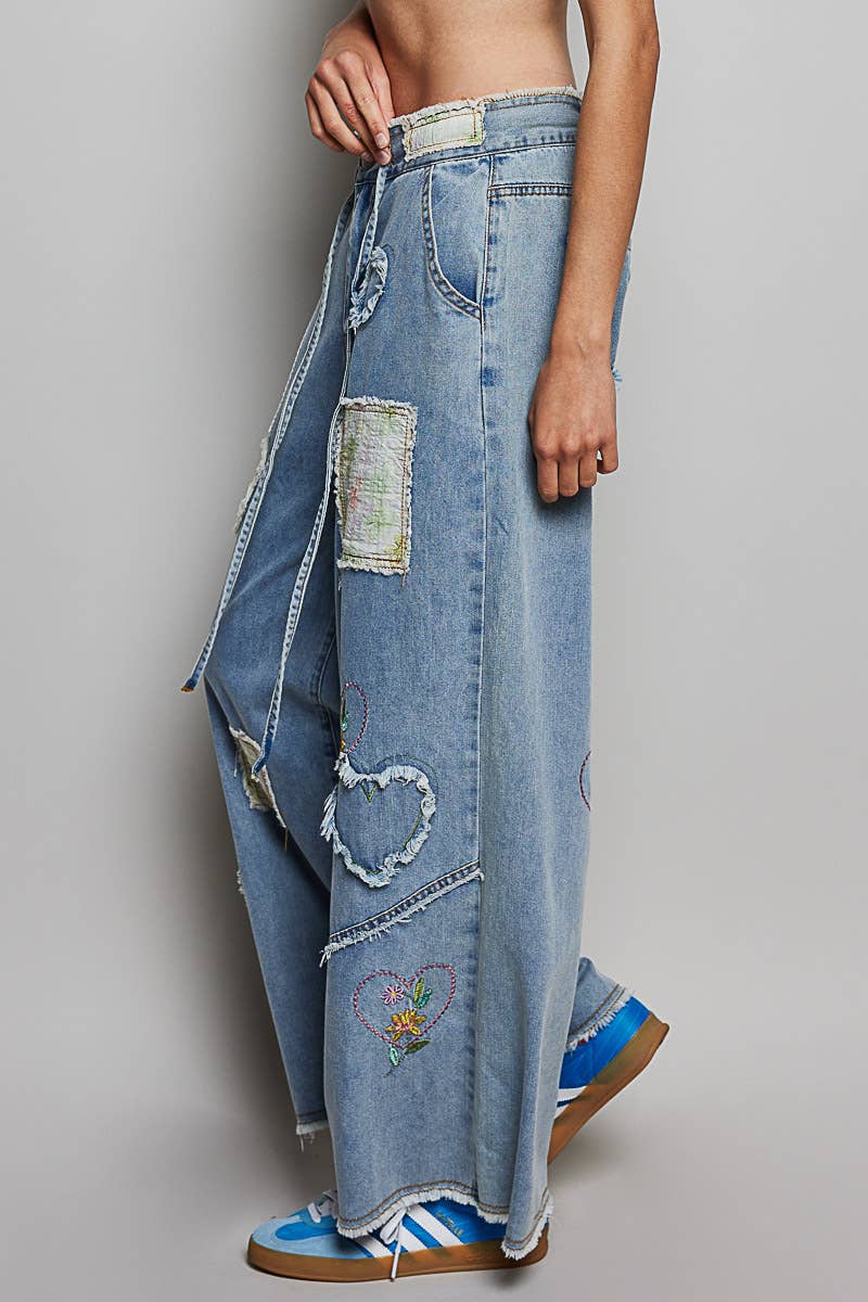 Waist Elastic Band Heart Floral Print Patch Wide Denim Pants