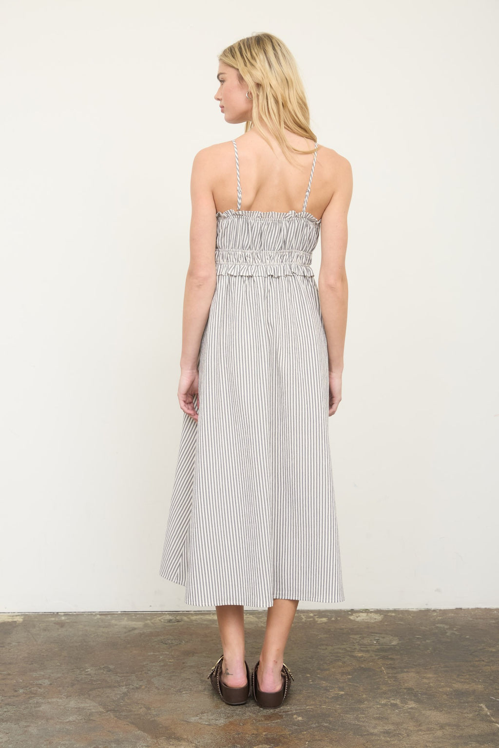 Stripe Spaghetti Strap Keyhole Ruffled Midi Dress