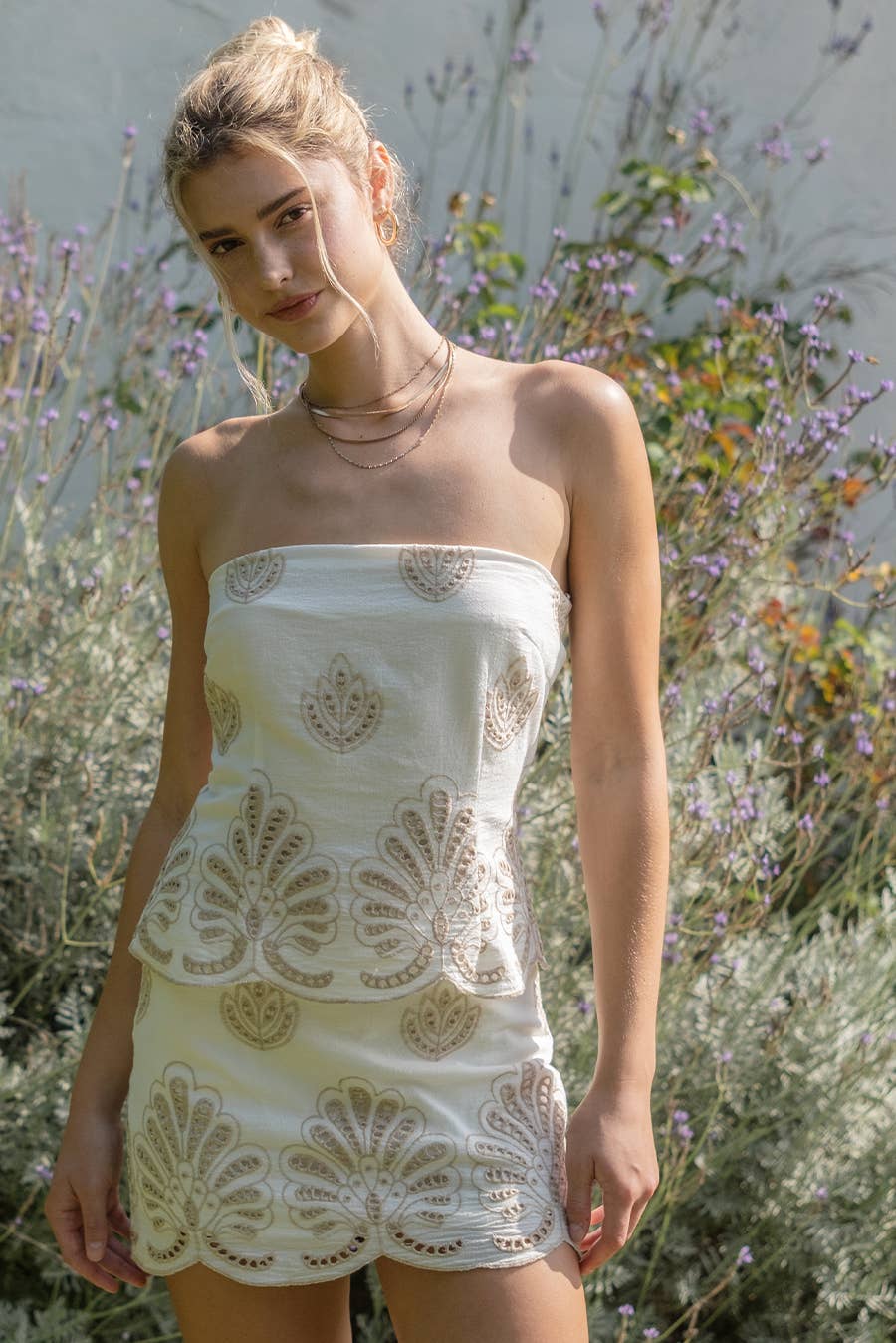 Embroidered Off-Shoulder Scalloped Mini Dress
