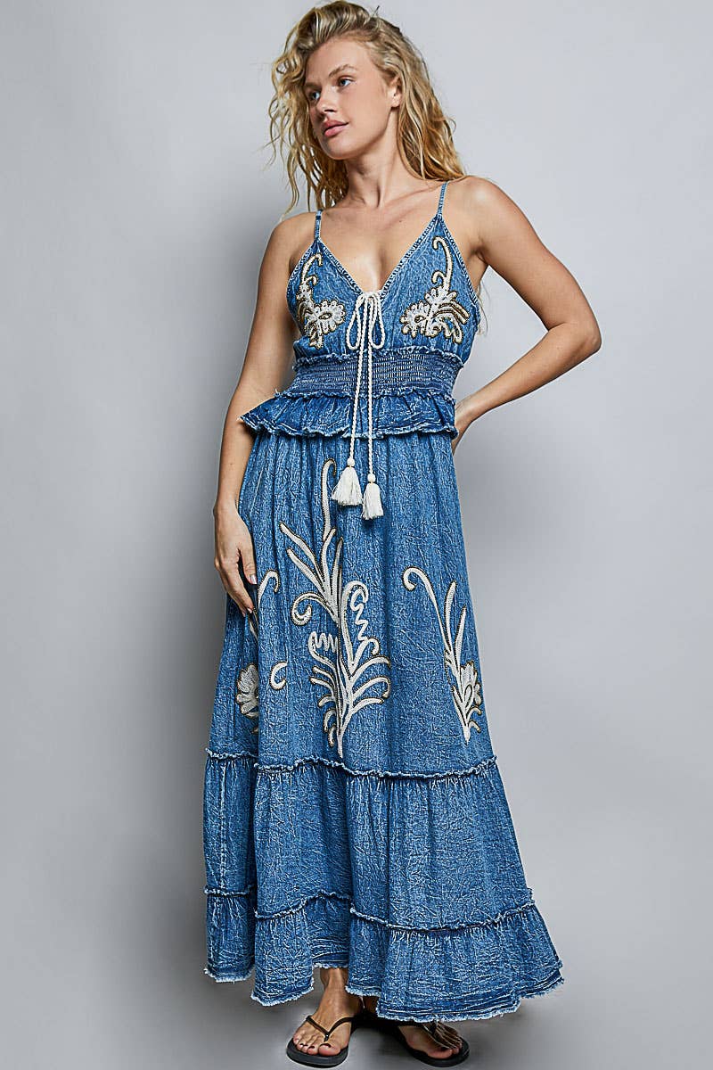 Smocked Waist Sequin Embroidery Deep V-Neck Denim Dress