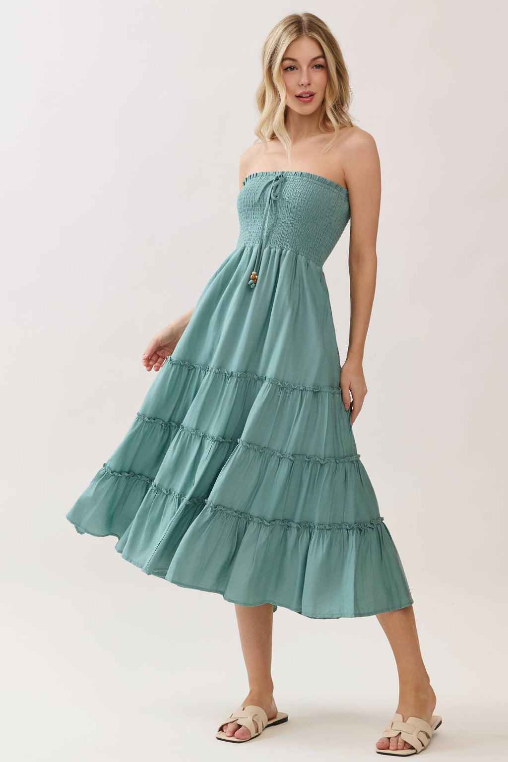Front and Back Smocked Tie Tiered Midi Dress