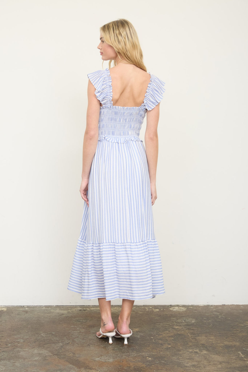 Stripe Smocked Ruffle Trim Midi Dress