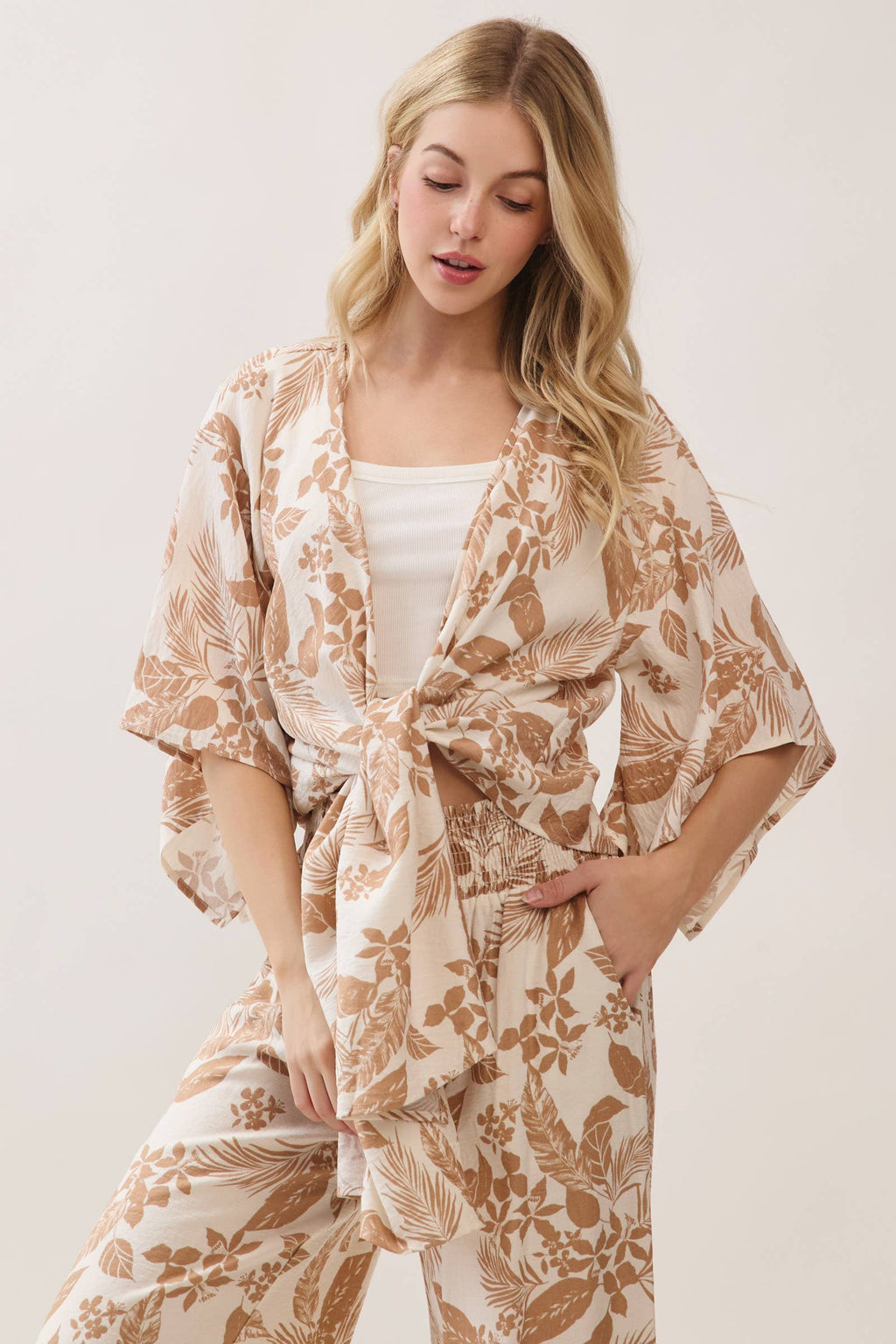 Three Quarter Tie Front Short Tropical Kimono Cardigan