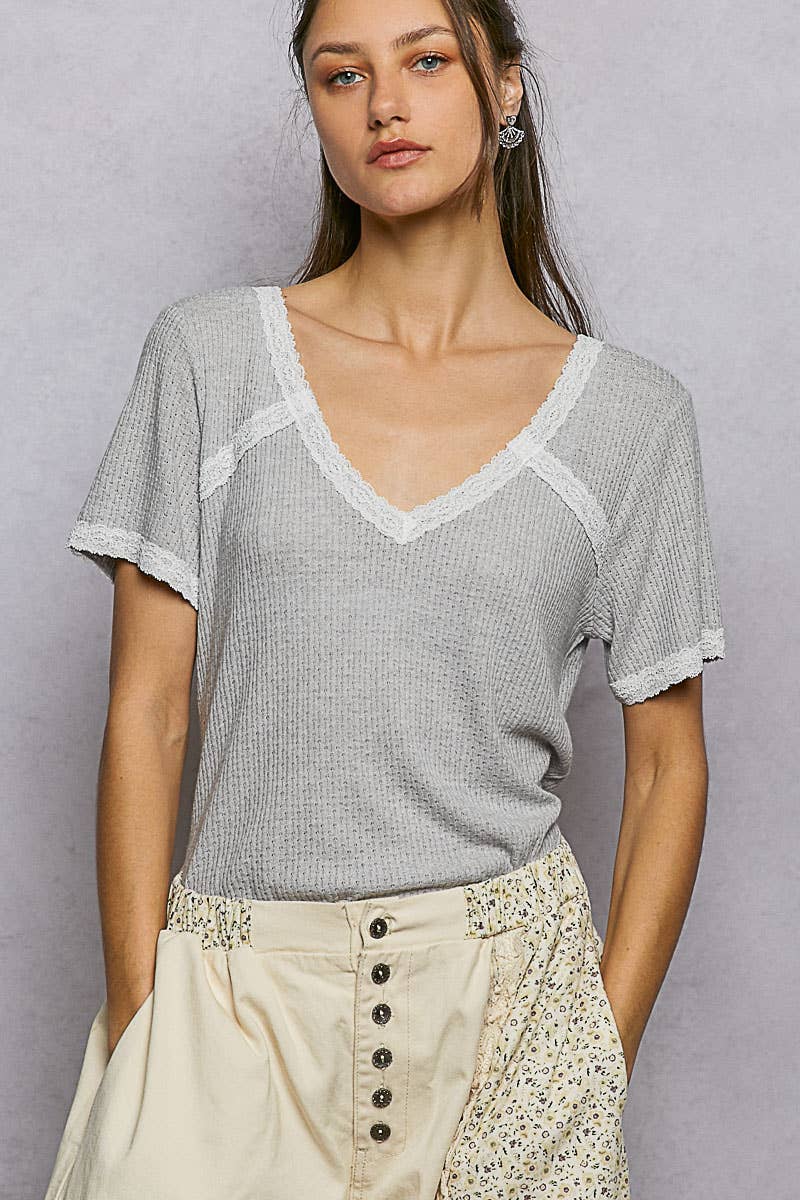 Textured Knit V-Neck Lace Accent Basic Short Sleeve Top