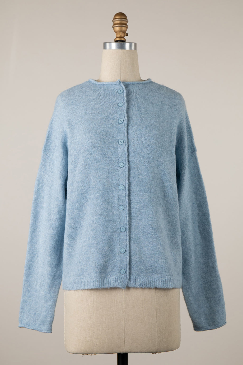 Fuzzy Knit Button Down High Collar Cropped Cardigan